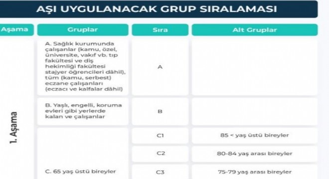 Sağlık Bakanlığının Covid-19 aşısı bilgilendirme platformu sayfası üzerinden yayımladığı şemaya göre aşılama 4 aşamada gerçekleşecek. 1. aşamada aşı olacaklar kendi içerisinde A, B ve C olmak üzere 3’e ayrıldı. A grubunda; sağlık kurumunda çalışanlar (kamu, özel, üniversite, vakıf vb. tıp fakültesi ve diş hekimliği fakültesi stajyer öğrencileri dahil), tüm (kamu, serbest) eczane çalışanları (eczacı ve kalfalar dahil), B grubunda; yaşlı, engelli, koruma evleri gibi yerlerde kalan ve çalışanlar, C grubunda; 65 yaş üstü bireyler yer alıyor. Onlar da kendi içlerinde 85 yaş üstü bireyler öncelikli olmak üzere sırayla 65 yaş üzeri tüm bireyleri kapsayacak şekilde aşılarını olabilecek.