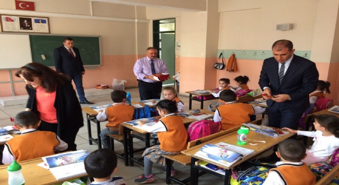 Bu sabah ilk ders zili çalması ile Aşkale ilce Kaymakamı Mehmet Aksu ve ilçe Milli Eğitim Müdürü Serhat Erdem öğrenceleri sınıflarında ziyaret ederek çeşitli hediyelerin yanı sıra çikolata ikram ettiler.