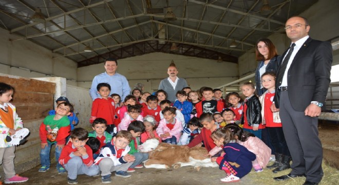 Öğrencilere çiftlik gezisi yaptırılarak inekler ve buzağılar gösterildi. Ana sınıfı öğrencileri küçük buzağılara yakın ilgi gösterdiler.