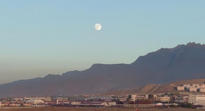 Gün batımının turuncu ve kırmızı tonları, batı ufkunu bir tablo gibi boyarken, doğu tarafından yükselen ay, gökyüzüne gümüşi ve soğuk bir ışık yaydı. Ay'ın evresinin dolunaya yakın olduğu ve atmosferin belirli bir berraklıkta olduğu zamanlarda bu denli net görülebiliyor.