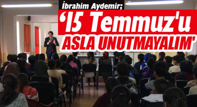 “15 Temmuz sıradan bir tarih değildir, bir çok yönüyle özel anlamlar ifade etmektedir, en mühimi millet kavramının millet tarafından yeniden algılanmasına vesile olmuştur.” diyen Aydemir, “Sayın Cumhurbaşkanımızın her fırsatta dile getirdiği, Tek vatan, tek devlet, tek bayrak ve tek millet gerçeğinin resim olarak hafızalara kazınmasını bu gece gördük. Daha önce, çoğu kesimin ufak tefek farklılıkları ayrılık gerekçesi saydıklarının ya da sandıklarının hiçbir önemi olmadığını, her türlü farklı düşünce yapılarının dahi sıkıntılı bir halde bir ve bütün olabildiklerini, yani vatan, devlet, bayrak kavramları etrafında tek millet şuurunda olduğumuzu gösterdi. Dahası, millet olarak demokrasiye ne denli bağlı olduğumuzu da bu gece dosta düşmana gösterdik.” Dedi.