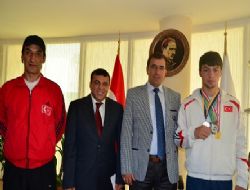 ERZURUM (İHA) - Erzurum Gençlik Hizmetleri ve Spor İl Müdürü Fatih Çintimar, Genç Milli Boks Takımı Başantrenörü Cahit Himoğlu ve Tunçkılıçspor Boks Antrenörü Ayhan Tunçkılıç ile birlikte kendisini makamında ziyaret eden şampiyon boksör Osman Aydın’ı kutladı. İstanbul’da yapılan ve 17 ülkeden 160’ın üzerinde boksörün katıldığı 27. Uluslararası Ahmet Cömert Boks Turnuvası’nda 69 kiloda şampiyon olarak hem Türkiye’nin hem de Erzurum’un gurur kaynaklarından biri olan Osman Aydın. GHSİM Müdürü Çintimar’a da şampiyona öncesinde verdiği destekten dolayı teşekkür etti.