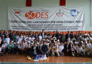 “Üzerime yağmur, dolu ve kar yağmadan spor yapmak istiyorum” adlı proje kapsamında SODES’in desteği ile alınan spor malzemeleri Aziziye Kaymakamı Zafer Öz’ün katılımı ile öğrencilere dağıtıldı.