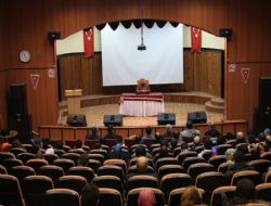 Konferans sonunda İl Milli Eğitim Müdürü Fatih Başak, Bahadıroğlu’na plaket takdim etti.