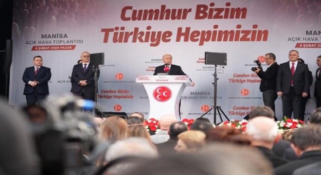 Milliyetçi Hareket Partisi (MHP) Genel Başkanı Devlet Bahçeli, 31 Mart yerel seçimleri öncesi ‘Cumhur bizim, Türkiye hepimizin’ temalı ikinci açık hava toplantısını MHP’li tek büyükşehir belediyesinin olduğu Manisa’da gerçekleştirdi. Manisa’nın Şehzadeler ilçesindeki Cumhuriyet Meydanı'na atlı birliklerin karşılamasıyla gelen Bahçeli, meydanda kendisini bekleyen binlerce vatandaşa seslendi. Manisa’nın coşkusuyla göz kamaştırdığını kaydeden Bahçeli, “2019'da beka için milli karar çağrısı yapmıştım. Manisa'nın ehline emanet edileceğini söylemiştim; hamdolsun Manisa ehline emanet edildi. Manisa yanımızda durdu. Manisa'yı hizmetle kucakladık. Manisa tarihimizin canlı şahididir. Devlet yönetiminin ilk durağıdır. 16 şehzade Manisa'da sancak beyliği yapmıştır. İmparatorluk çınarının kökü Manisa'dan sulanmış, milli mücadele zaferi Manisa'da körüklenmiştir. Türkiye Cumhuriyeti'nin 100. yıl dönümü sizlerin desteği ile taçlandı. Cumhurbaşkanlığı seçimlerinde korkuluklar yıkıldı. 8 ay önce yine Manisa'ya sahip çıkıp, sağlam iradeyi seçerek 'istikrar sürsün Türkiye büyüsün' tercihinde bulundunuz. 31 Mart'ta da yerel seçimlerde de inanıyorum ki Manisa yine sevdalılarına kucağını açacaktır. Varlığına ve birliğine ipotek koydurmayacaktır. 31 Mart'ta sandığa gidecek misiniz? Sandığa sahip çıkacak mısınız? Geleceğinize sahip çıkacak mısınız? Huzurunuza sahip çıkacak mısınız? Cumhur İttifakı'na destek çıkacak mısınız? Madem evet diyorsunuz, sayın Cengiz Ergün'ü bir kez daha iradenize emanet ediyorum. 2023'ün zafer yolu Manisa'dan ardına kadar açıldı. 14 Mayıs ve 28 Mayıs seçimleriyle önümüze çıkarılan sanal korkuluklar yıkıldı, cumhur demokratik iradesiyle vaziyet alıp Türkiye Yüzyılı'nın meşalesini yaktı” dedi.