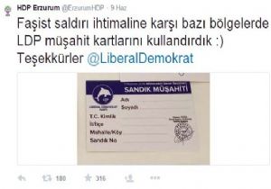 HDP’nin, 7 Hazirandaki 25. Dönem Milletvekili Genel Seçimi’nde kendi sandık görevlilerinin saldırıya uğramamalarına karşı ilginç bir uygulama yaptığı ortaya çıktı. HDP, kendi sandık görevlilerine Liberal Demokrat Parti’nin (LDP) sandık müşahit kartlarını dağıtarak olası saldırıların önüne geçmeye çalıştı. HDP, LDP’nin müşahit kartlarıyla sandıkta gözlemcilik yapan HDP’liler için Twitter’daki hesabından teşekkür mesajı yayınladı. Mesajda, “Faşist saldırı ihtimaline karşı bazı bölgelerde LDP müşahit kartlarını kullandırdık. Teşekkürler Liberal Demokrat Parti” ifadeleri kullanıldı. Twitter kullanıcıları yayınlanan kullanılan yöntemle şaşkınlık yaşarken, bazı kullanıcılar da uygulamaya destek verdi.