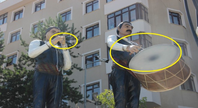Erzurum'da yaklaşık 3 yıl önce Büyükşehir Belediyesi tarafından yaptırılan yöresel halk oyunlarından bar ekibinin heykelinde davulcunun tokmağı, zurnacının da zurnası çalındı.