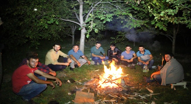 Tarla başında yakılan ateşin etrafından toplanarak domuzlara karşı nöbet tutan gençler mısır közleyip, semaver de çay içmeyi de ihmal etmiyorlar.