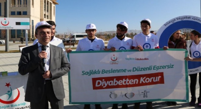 Diyabet Günü kapsamında toplanan sağlıkçı ve öğrenciler, diyabete dikkati çekmek amacıyla "diyabet her aileyi ilgilendir" yazılı tişörtler giyinip "çok yemek şişmanlık, sonrası pişmanlık", "Düzenli egzersiz sağlığınızı korur" gibi pankart ve afişler açarak yürüyüş yaptı.
