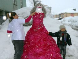 Hem gelinlik satan hem de bayan kuaförlüğü yapan Yıldız Somer, bir saatte yapıp süslediği kardan geline nişan elbisesi giydirdi. Yaptığı kardan geline çevredekilerin yoğun ilgi gösterdiğini söyleyen Somer, "Sabah saatlerinde iş yerlerinin önünde farklı figürlerde farklı kardan adamlar dikkatimi çekti. Daha sonra kendi kendime, ‘Siz kardan damat yaparsınız da ben kardan gelin yapamaz mıyım?’ dedim ve başladım kardan bir gelin yapmaya. Boyu bir metreyi geçen bir gelin yaptım. Bitirince bir güzel de makyajını yaptım ve nişan elbisesi giydirdim. Değişik bir şey oldu. Şimdilik nişanımızı yaptık. İnşallah ilerleyen günlerde gelinlik de giydireceğiz. Biraz ellerim üşüdü ama verdiğim çabaya değdi çünkü vatandaşlar yoğun ilgi gösteriyor. Bu da beni mutlu etti" dedi.