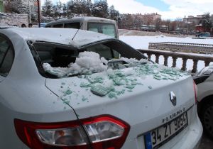 Erzurum’da yüksek binanın çatısından düşen kar kütlesi bir otomobilde maddi hasara yol açtı.