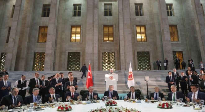 Cumhurbaşkanı Erdoğan, Türkiye Büyük Millet Meclisi’nde tüm dönem milletvekilleri ile iftar programında bir araya geldi. Erdoğan, yaptığı konuşmada, “Bu meclis cumhuriyeti kuran meclistir, bu meclis çok partili siyasi hayata geçişin mimarı olan meclistir, bu meclis darbelere, cuntalara, vesayete karşı cesaretle dimdik duran meclistir, bu meclis ülkemizin kalkınması, gelişmesi, büyümesi yolunda atılan tüm adımların öncüsü olan bir meclistir, bu meclis milli iradenin üstünlüğü ilkesinden aldığı güçle ülkemize ve milletimize yönelik saldırıların önünü kesen bir meclistir, bu meclis tarihimizin en önemli yönetim sistemi değişikliğini demokratik sistem içinde başarıyla gerçekleştiren meclistir, bu meclis terör örgütleriyle, ihanet çeteleriyle, beşinci kol unsurlarıyla ülkemize diz çöktürmeye çalışanların heveslerini kursaklarında bırakan meclistir. Bunun için, bu çatı altında görev yapan her bir arkadaşımız her türlü teşekkürü ve takdiri hak etmektedir. Sizlerin şahsında, 1920’den bugüne kadar görev yapmış tüm milletvekillerimize şahsım, ülkem ve milletim adıma şükranlarımı sunuyorum” ifadelerini kullandı.