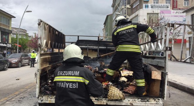 Olay bugün öğle saatlerinde Erzurum Cumhuriyet Caddesi’nde meydana geldi. Alınan bilgilere göre, Harun Abdullahoğlu karton topladığı 25 LK 647 plakalı kamyonetiyle seyir halindeyken cadde ortasında kamyonet bilinmeyen bir nedenden dolayı alev aldı. Durumu fark eden Abdullahoğlu, son anda araçtan kendisini dışarı atarak yanmaktan kurtuldu. Olayın itfaiyeye bildirilmesi üzerine caddeye polis ve itfaiye ekipleri sevk edildi. Alev alan araç nedeniyle caddede yürüyen vatandaşlar da paniğe kapıldı. Araç şoförü Harun Abdullahoğlu, “Yangın aniden başladı nasıl çıktığını anlayamadım kendimi araçtan zorla dışarı attım” dedi. Polis ekipleri, olay yerinde toplanan vatandaşları uzaklaştırırken itfaiye ekipleri yanan kamyoneti kısa sürede söndürdü.