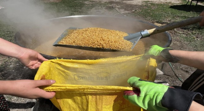 Kendi ektikleri buğdayları hasat ettikten birkaç aileyle bir araya gelip dev kazanlarda buğday kaynatma işlemine başladıklarını söyleyen Gülden Yıldız, büyük emek ve zahmetle yapılan bu işlemin daha sağlıklı olduğunu vurgulayarak, “Sabah 05.00’te uyandık. Büyükçe kazanlarımızı odun ateşine koyduk. Bulgurlarımızı içine boşaltıp kaynatmaya başladık. Daha sonra torbalara koyup süzdürdük. Birkaç gün boyunca kuruyacak, kurduktan sonra değirmene götürüp öğüteceğiz. Bu şekilde kışlık erzağımızı hazırlamış olacağız. Biraz zahmetli bir iş oluyor ama güzel oluyor. Dışarıdakinden daha lezzetli oluyor” ifadelerine yer verdi.