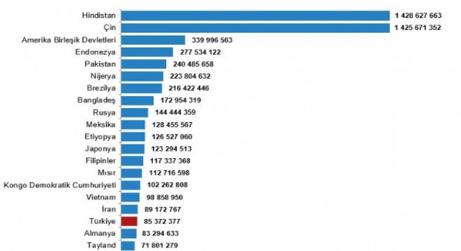 Türkiye, 85 milyon 372 bin 377 kişi nüfusu ile nüfus büyüklüğüne göre 194 ülke arasında 18. sırada yer alırken, dünya toplam nüfusunun yüzde 1,1'ini oluşturdu.