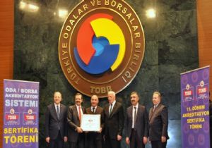 Türkiye Odalar ve Borsalar Birliği 11. Dönem Akreditasyon Sertifika Töreni Ankara’da gerçekleştirildi. 5 yıldızlı oda unvanı bulunan Erzurum Ticaret ve Sanayi Odası, 4’ncü kez sertifika aldı. 5 yıldızlı oda sertifikasını TOBB Başkanı M.Rifat Hisarcıklıoğlu, Ticaret ve Sanayi Odası Meclis Başkanı Saim Özakalın’a verdi.