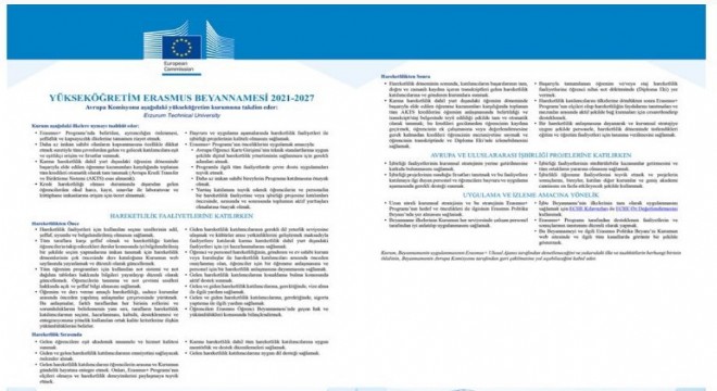 Erzurum Teknik Üniversitesi (ETÜ) Erasmus Koordinatörlüğü’nün 2020 yılının Mayıs ayında Avrupa Komisyonu’na yaptığı Erasmus Charter for Higher Education-ECHE (Yükseköğretim Erasmus Beyannamesi) başvurusu, yapılan değerlendirmeler sonucunda 100 tam puan alarak 2021-2027 dönemi için ECHE Akreditasyonuna sahip olmaya hak kazandı.