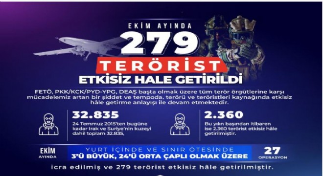 Milli Savunma Bakanlığı, son bir ayda yurt içi ve sınır ötesinde 3’ü büyük, 24’ü orta çaplı olmak üzere 27 operasyon icra edildiğini ve 279 terörist etkisiz hale getirildiğini belirterek, 24 Temmuz 2015’ten bugüne kadar toplam 32 bin 835, bu yılın başından itibaren ise 2 bin 360 teröristin etkisiz hale getirildiğini açıkladı.