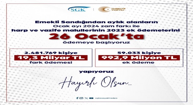 Sosyal Güvenlik Kurumu (SGK), Emekli Sandığından aylık alanların ocak ayı 2024 zam farkı ile harp ve vazife malullerinin 2023 ek ödemelerini 26 Ocak’ta yatırmaya başlayacaklarını duyurdu.