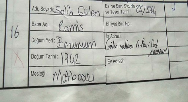 Öte yandan Erzurum Matbaa, Kırtasiye ve Tabelacılar Esnaf Odası Başkanı Hikmet Karaca, "FETÖ’nün emekliliği tamamen sahte. Kayıtlarımızda mevcut" dedi. Karaca, "Takriben 7-8 ay önce SGK Genel Müdürü Erzurum’a gelmişti. Konuyla alakalı bizimle irtibat kurdular. FETÖ’nün Erzurum’da matbaada çalışıp çalışmadığına dair bilgilerimize başvuruldu. Biz de elimizdeki mevcut oda kayıtlarını çıkarmak suretiyle FETÖ’nün kardeşi Salih Gülen kayıtlı üye. 2016 Mayıs ayına kadar burada olduğunu biliyoruz. 15 Temmuz sürecinde kendisi de diğerleri gibi kayıplara karıştı. Fetullah Gülen’in Erzurum’da bulunan Salih Gülen’e ait Gülen matbaasında sigortalı gösterilerek emekli edildiğini biliyoruz. Bugüne kadar ben FETÖ’nün Erzurum’da matbaada çalıştığını görmedim. Bu emeklilik tamamen sahte" diye konuştu.
