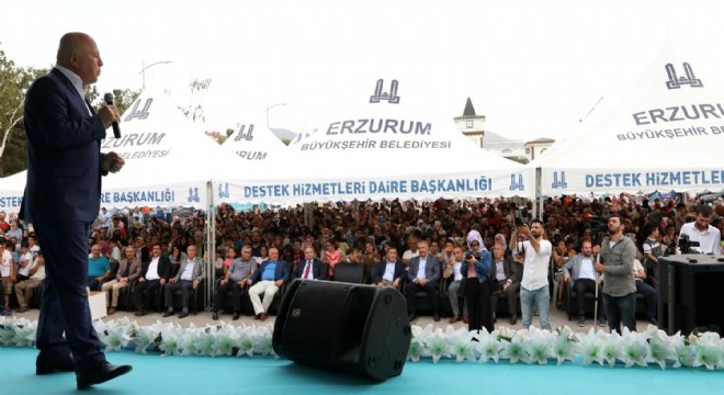 “Göreve geldiğimiz günden bu yana sporda hamle yatırımlarla Erzurum’u marka bir kent haline getirdik. 117 ulusal 34’te uluslararası organizasyonla Erzurum Avrupa’nın en aktif spor şehri oldu. Olimpiyat kentinde kulüpleşme ve tesisleşmeye büyük bir önem verdik. Erzurumspor Tesisleri, Er Meydanı, golf sahaları, alttan ısıtmalı futbol sahaları, 6 açık 3 kapalı tenis kortu, 2 yarı olimpik yüzme havuzu, 2 spor salonu, 1 basketbol, 1 voleybol sahası, trafik eğitim pisti, 6 fitness salonu, 2 güreş antrenman sahası ve daha ismini sayamayacağım toplam 50’yi aşkın tesisi ilimizin spor hayatına sunduk. Olimpiyat kentinin takımını 3 yılda 3 kupa alarak bir Dünya başarısına imza attık. Erzurumspor’u Süper Lig’e çıkardık. Nasıl ki takımımızı şampiyon yaptıysak bu kadim şehri şampiyon şehirlerin yer aldığı Süper Kentler klasmanına çıkaracağız. Bizlere olan destek ve duanızla inşallah bu şehrin gelişim ve değişimi her alanda devam edecek.”