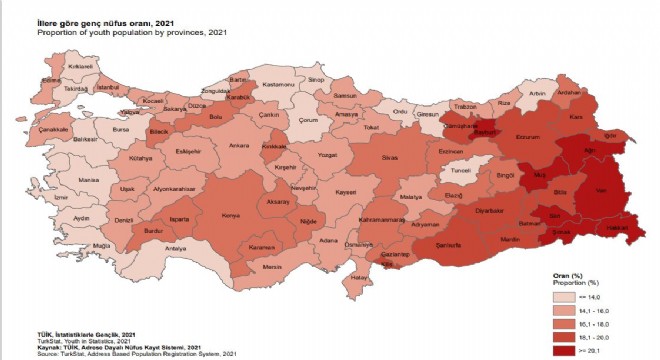 ADNKS sonuçlarına göre 2021 yılında genç nüfus oranının en yüksek olduğu il, yüzde 22,8 ile Hakkari oldu. Bu ili yüzde 22,1 ile Şırnak ve yüzde 21,8 ile Siirt izledi.
