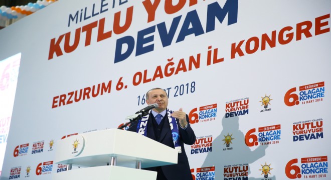 Cumhurbaşkanı ve AK Parti Genel Başkanı Recep Tayyip Erdoğan, partisinin Erzurum İl Kongresinde önemli açıklamalarda bulundu. 16 Nisan halk oylamasında yüzde 75'lik oranıyla Türkiye sıralamasında beşinci sırada yer alarak vefasını gösteren Erzurum’a bir kez daha şükranlarını sunduğunu söyleyen Cumhurbaşkanı Erdoğan, "İlçeler arasında öne çıkan yüzde 91'lik evet oyuyla Pazaryoluna, yüzde 90'lık Tortum ve Köprüköy’e yüzde 85’lik oranla Uzundere ve İspir’e, yüzde 83 ile Aşkale ve Narman’a, yüzde 82 ile Aziziye, Oltu ve Pasinler ilçelerimize özellikle teşekkür ediyoruz" dedi.