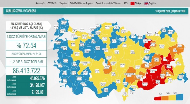 Sağlık Bakanlığı aşı haritasını yayımladı. Aşı oranı yüzde 65.1’e yükselen Erzurum Turuncu kategoriden sarı kategoriye geçti. Bölgede en az oranda aşılama yüzde 53.7 ile Bitlis’te, en yüksek aşı oranı ise yüzde 77.6 ile Tunceli’de kaydedildi.