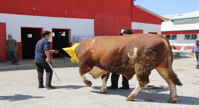 Erzurum hayvan pazarında 1 ton 100 kilogram ağırlığındaki kurbanlık tosun, 25 bin TL’den satışa çıkarıldı.