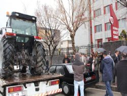 Erzurum’da iki kişi arasında anlaşmazlığa yol açan traktör, çekici ile Erzurum Adliyesi önüne getirilerek keşfi yaptırıldı.