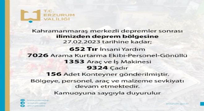 Kahramanmaraş merkezli depremler sonrası Erzurum’dan deprem Bölgesine 652 tır insani yardım, 7 bin 26 kişilik arama kurtarma ekibi, personel, gönüllü;  bin 353 araç ve iş makinesi, 9 bin 324 çadır, 156 adet konteyner gönderildiği açıklandı.