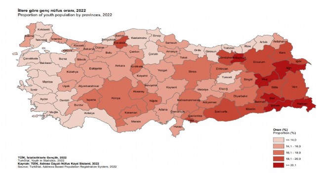 ADNKS sonuçlarına göre 2022 yılında genç nüfus oranının en yüksek olduğu il, yüzde 22,0 ile Hakkari oldu. Bu ili yüzde 21,7 ile Şırnak ve yüzde 21,1 ile Siirt izledi. Genç nüfus oranının en düşük olduğu il yüzde 12,3 ile Muğla ve Balıkesir oldu. Bu illeri yüzde 12,7 ile Ordu, yüzde 12,8 ile Tunceli, Sinop ve Kırklareli illeri izledi.