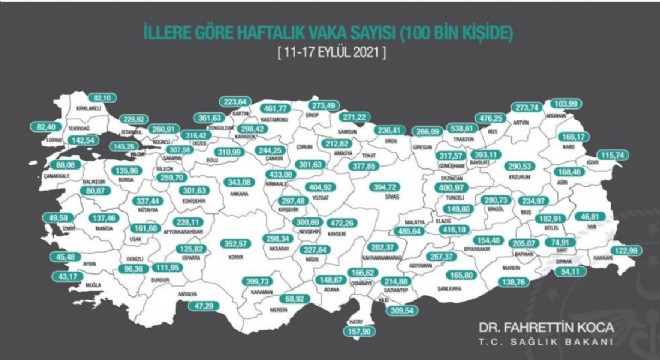 Sağlık Bakanı Koca, sosyal paylaşım sitesi Twitter hesabından yaptığı paylaşımda, “11-17 Eylül arasında, 100.000 kişi içinde bir haftalık toplam yeni Covid-19 vaka sayısı neydi? Yaşadığınız, gidip geldiğiniz ildeki durumu haftalık insidans haritamızdan öğrenebilirsiniz. 11-17 Eylül arasında vaka yoğunluğu bir önceki haftaya göre en çok artan 10 ilimiz: Kastamonu, Kırıkkale, Zonguldak, Tokat, Trabzon, Malatya, Yozgat, Düzce, Erzincan, Çorum! Bu illerden birindeyseniz şimdi daha da dikkatli olmalısınız. Nihai çözüm aşı, tedbirler şart” dedi.