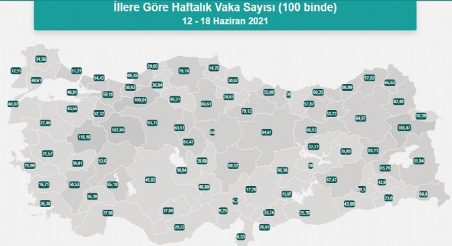 Sağlık Bakanı Fahrettin Koca, 12-18 Haziran arasında illere göre her 100 bin kişide görülen Covid-19 vaka sayılarını açıkladı. İllere göre haftalık Covid-19 vaka sayısı, her 100 bin kişide İstanbul'da 51,27, Ankara'da 93,11, İzmir'de 25,99 oldu.