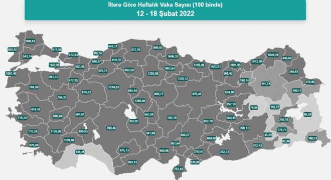 12 -18 Şubat 2022 iller her yüz binde görülen vaka sayısı dağılımı şöyle oluştu: