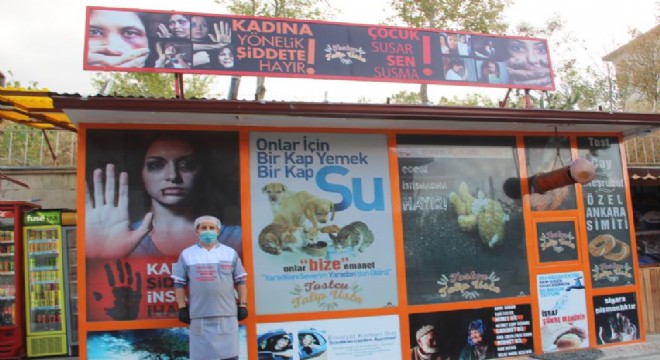 Erzurum’da bir esnaf şiddete dikkat çekmek için iş yerinin dışını sosyal mesajlarla kaplattı. Meşhur tostlarıyla vatandaşların karnını doyurduğu büfe ayrıca şiddete karşı farkındalık oluşturuyor.