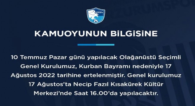 Erzurumspor’un 10 Temmuz’da yapılması planlanan olağanüstü kongresi 17 Ağustos Pazar gününe ertelendi. Mavi Beyazlı Kulüpten yapılan açıklamada, ’10 Temmuz Pazar günü yapılacak olağanüstü seçimli genel kurulumuz, Kurban Bayramı nedeniyle 17 Ağustos 2022 tarihine ertelenmiştir. Genel Kurulumuz 17 Ağustos’ta Necip Fazıl Kısakürek Kültür Merkezinde saat 16:00’da yapılacaktır. ‘ denildi.
