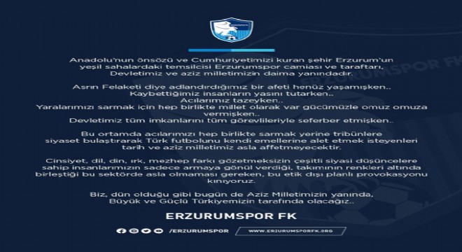 Anadolu’nun önsözü ve Cumhuriyeti kuran şehir Erzurum’un yeşil sahalardaki temsilcisi Erzurumspor camiası ve taraftarı, devletimiz ve aziz milletimizin daima yanındadır. Asrın felaketi diye adlandırdığımız bir afeti henüz yaşamışken, kaybettiğimiz insanların yasını tutarken, acılarımız tazeyken, yaralarımızı sarmak için hep birlikte millet olarak var gücümüzle omuz omuza vermişken, devletimiz tüm imkanlarını tüm görevlileriyle seferber etmişken; bu ortamda acılarımızı hep birlikte sarmak yerine tribünlere siyaset bulaştırarak Türk futbolunu kendi emellerine alet etmek isteyenleri tarih ve aziz milletimiz asla affetmeyecektir. Cinsiyet, dil, din, ırk, mezhep farkı gözetmeksizin çeşitli siyasi düşüncelere sahip insanlarımızın sadece armaya gönül verdiği, takımının renkleri altında birleştiği bu sektörde asla olmaması gereken bu etik dışı planlı provokasyonu kınıyoruz. Biz, dün olduğu gibi, bugün de Aziz Milletimizin yanında, büyük ve güçlü Türkiyemizin tarafında olacağız. ‘