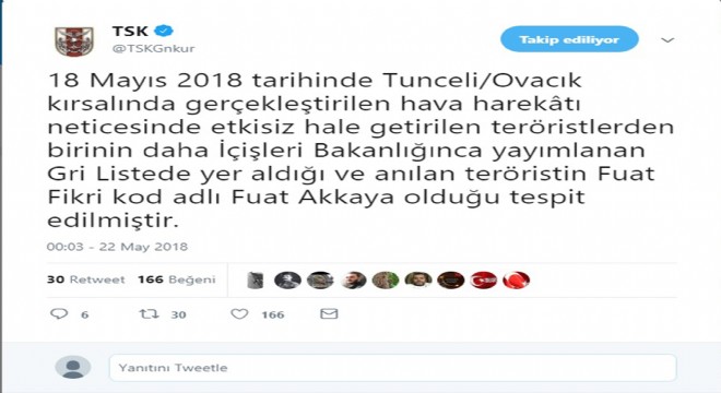 TSK'nın sosyal paylaşım sitesi Twitter üzerinden yapılan paylaşımda, "18 Mayıs 2018 tarihinde Tunceli/Ovacık kırsalında gerçekleştirilen hava harekatı neticesinde etkisiz hale getirilen teröristlerden birinin daha İçişleri Bakanlığınca yayımlanan gri listede yer aldığı ve anılan teröristin Fuat Fikri kod adlı Fuat Akkaya olduğu tespit edilmiştir" denildi.