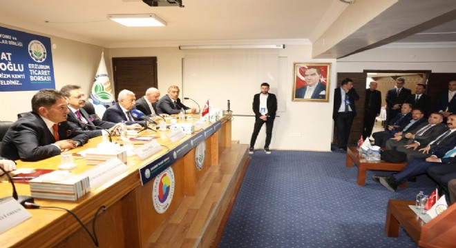 Ziyaretin sonunda ETB Başkanı Hakan Oral, TOBB Başkanı Rifat Hisarcıklıoğlu ve TESK Başkanı Bendevi Palandöken’e Erzurum’a özgü el işlemeli bakır ibrik takımı hediye etti.