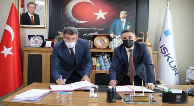 Erzurum Çalışma ve İş Kurumu İl Müdürlüğünde imzalanan protokolü Erzurum İŞKUR İl Müdürü Abdulkadir Mutlu ve Narman Belediye Başkan V. Yavuz Soylu imzaladı.