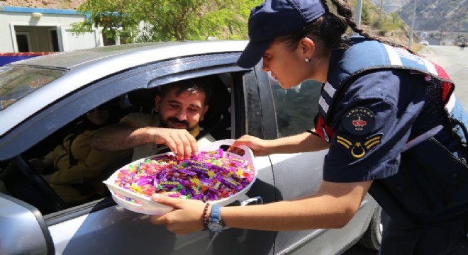 Artvin-Erzurum karayolu 2. kilometresindeki kontrol noktasında yol kontrol faaliyetinde bulunan jandarma ekipleri, sürücülerin ve yolcuların Kurban Bayramı'nı kutlarken çeşitli ikramlarda da bulunuyor. Ekipler bu sırada sürücü ve yolculara emniyet kemeri kullanmanın önemini, seyir halinde telefonla uğraşmamalarını, uykusuz araç kullanmamalarını ve trafik kurallarına uymaları konusunda bilgilendiriyor.
