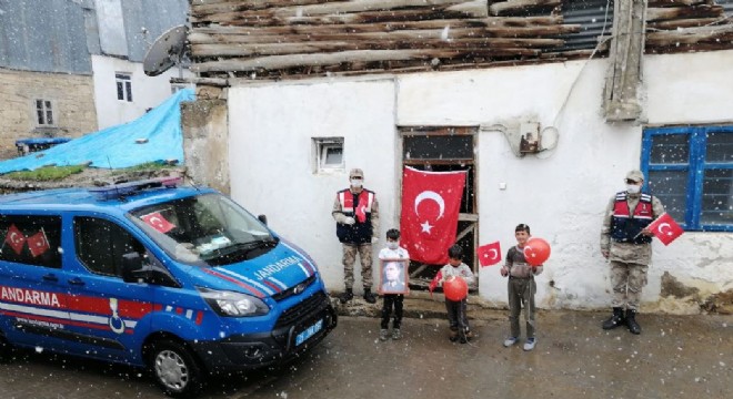 Erzurum İl Jandarma Komutanlığı 23 Nisan kutlamaları çerçevesinde ekip araçlarını süsleyip köylerde ki çocuklara bayrak, balon ve oyuncak dağıtıp, pasta keserek sürpriz yaptı.