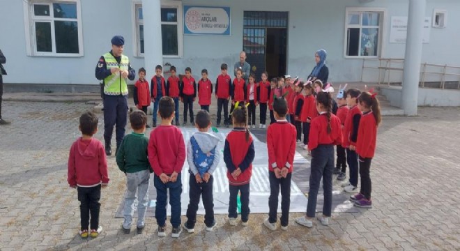 Kars’ın Arpaçay ilçesi Atçılar köyü ilkokulu öğrencileri jandarma ekiplerince karşıdan karşıya geçiş, önce yaya uygulaması, trafik levhaları ve anlamları, okul servis aracı biniş-iniş kuralları ve emniyet kemerinin önemi konularında bilgilendirildi.