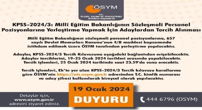 ÖSYM Başkanlığı’ndan yapılan açıklamada, Milli Eğitim Bakanlığının sözleşmeli personel pozisyonlarına 657 sayılı Devlet Memurları Kanunu’nun 4/B maddesi çerçevesinde istihdam edilmek üzere yerleştirme yapılacağını bildirdi. Adayların tercihlerini 19-25 Ocak tarihleri arasında yapabileceği belirtilen açıklamada, “Tercih işlemleri, 19 Ocak tarihinde saat 10.00’da başlayacak ve 25 Ocak tarihinde saat 23.59’da sona erecektir. Tercih işlemleri, Ek’te yer alan alan KPSS-2024/3 tercih kılavuzu kurallarına göre ÖSYM’nin 'https://ais.osym.gov.tr' adresinden T.C. kimlik numarası ve aday şifresi kullanılarak bireysel olarak yapılacaktır. Adayların tercih işlemleri için kılavuzu dikkatle incelemeleri gerekmektedir” denildi.