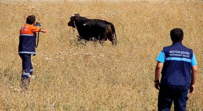 Dadaşkent semtinde kaçan kurbanlık dana da boş araziye yöneldi. Boğa timinin uyuşturucu iğnesine rağmen ayakta duran dana bir süre sonra düşerek yere yığıldı.