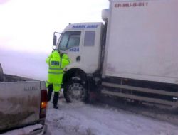 Dün akşam saatlerinde Erzurum’un Köprüköy ilçesi Şehitler mevki rampasında ara ara kuvvetli tipi nedeniyle karayolunda sürücüler zor anlar yaşadı. Yağan karın ardından çıkan tipi nedeniyle yoldan çıkan tonajlı arabalar karayolları yetkililerince kurtarıldı. Çok sayıda araç ise tipiden dolayı yollarda mahsur kaldı. Mahsur kalan araç sürücülerinin imdadına ise Köprüköy Emniyet Amirliğine ait trafik birimleri yetişip, çay ikramında bulundu.
