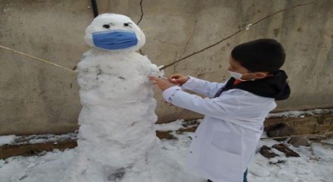 Van’ın Çaldıran ilçesinde etkili olan kar yağışını fırsat bilen 5 yaşındaki Miraç Oktay Hanalp, yaptığı kardan adama maske takıp korona virüs aşısı yaptı.
