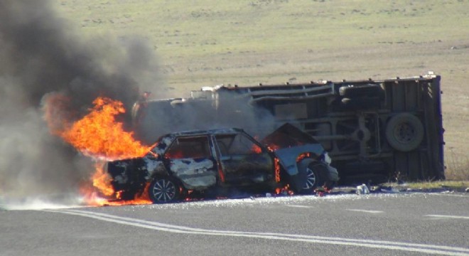 Kars'ta kamyonetle otomobilin çarpıştığı kazada, otomobil alev topuna dönüp yanarken, kamyonet ise yan yattı.