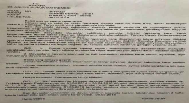 Mali genel kurulun iptali için açılan davanın son duruşması 6 Şubat 2018 tarihinde, 2016/321 esas nolu dosya ile görüşüldü. Ankara 23. Asliye Hukuk mahkemesi hakimi mali genel kurulda federasyonun 01.04.2014-30.04.2016 dönemine ait denetleme kurulu raporunun 5.6.7.8.9. ve 10.'cu maddelerinin ibra açısından genel kurulun oyuna sunulması, burada değerlendirilmesi gerektiğinde 01.06.2016 tarihinde yapılmış olan mali kurulda denetleme kurulu raporunun tamamının ibra edilmediğinin tespitine karar verdi.